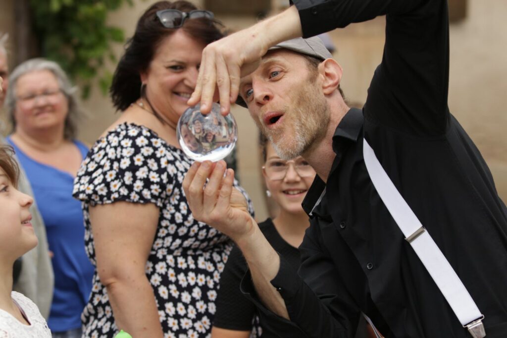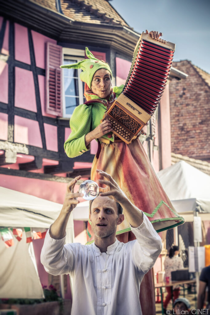 Nous déambulons avec énergie et spontanéité, créant des instants uniques où le lien avec le public se tisse naturellement. Jonglage et musique live ou enregistrée, improvisation et interactions rythment chaque passage, toujours ancré dans l’instant présent !